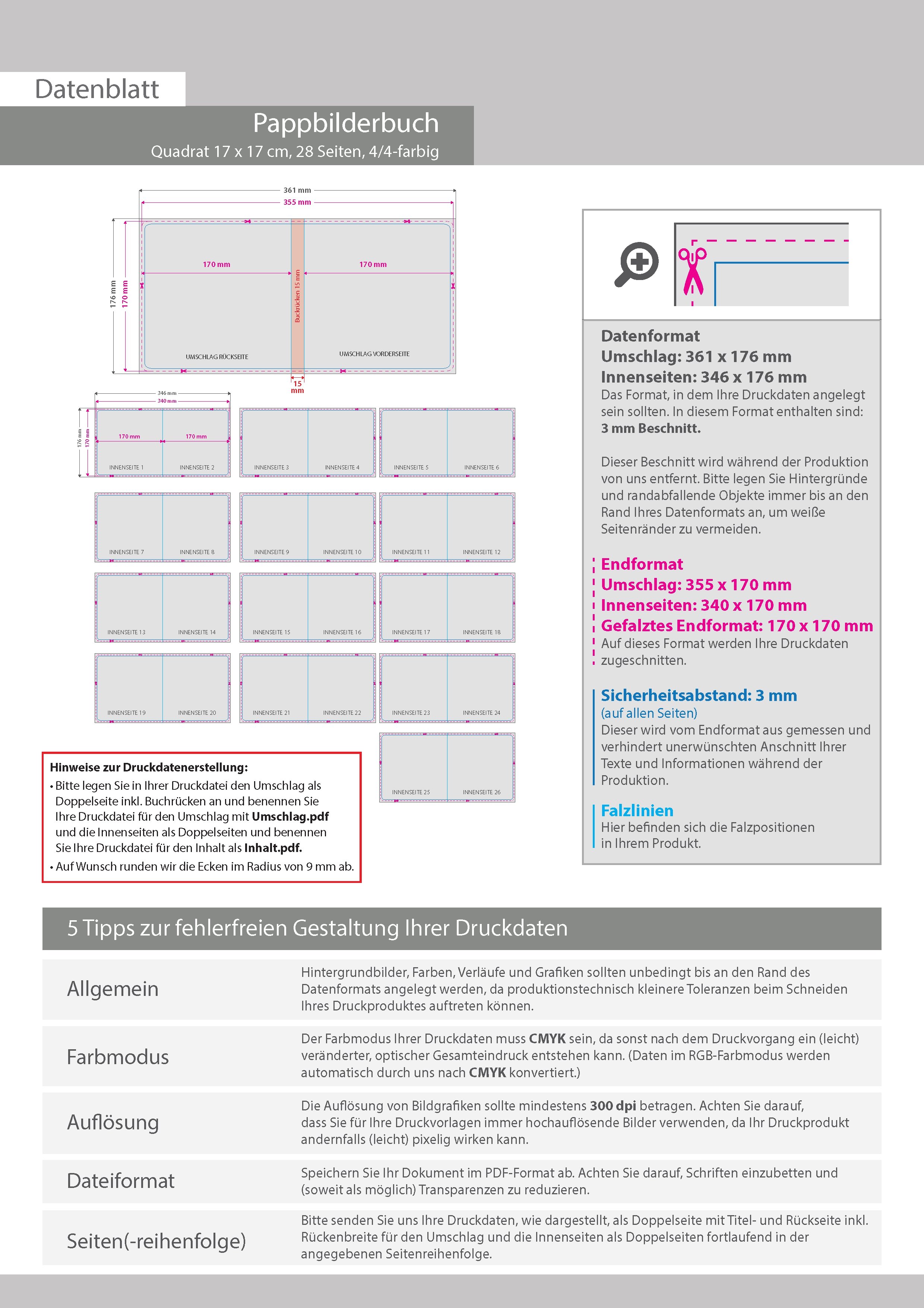 Pappbilderbuch mit Lay-Flat-Bindung, Quadrat 17 x 17 cm, 28 Seiten, 4/4-farbig beidseitig bedruckt