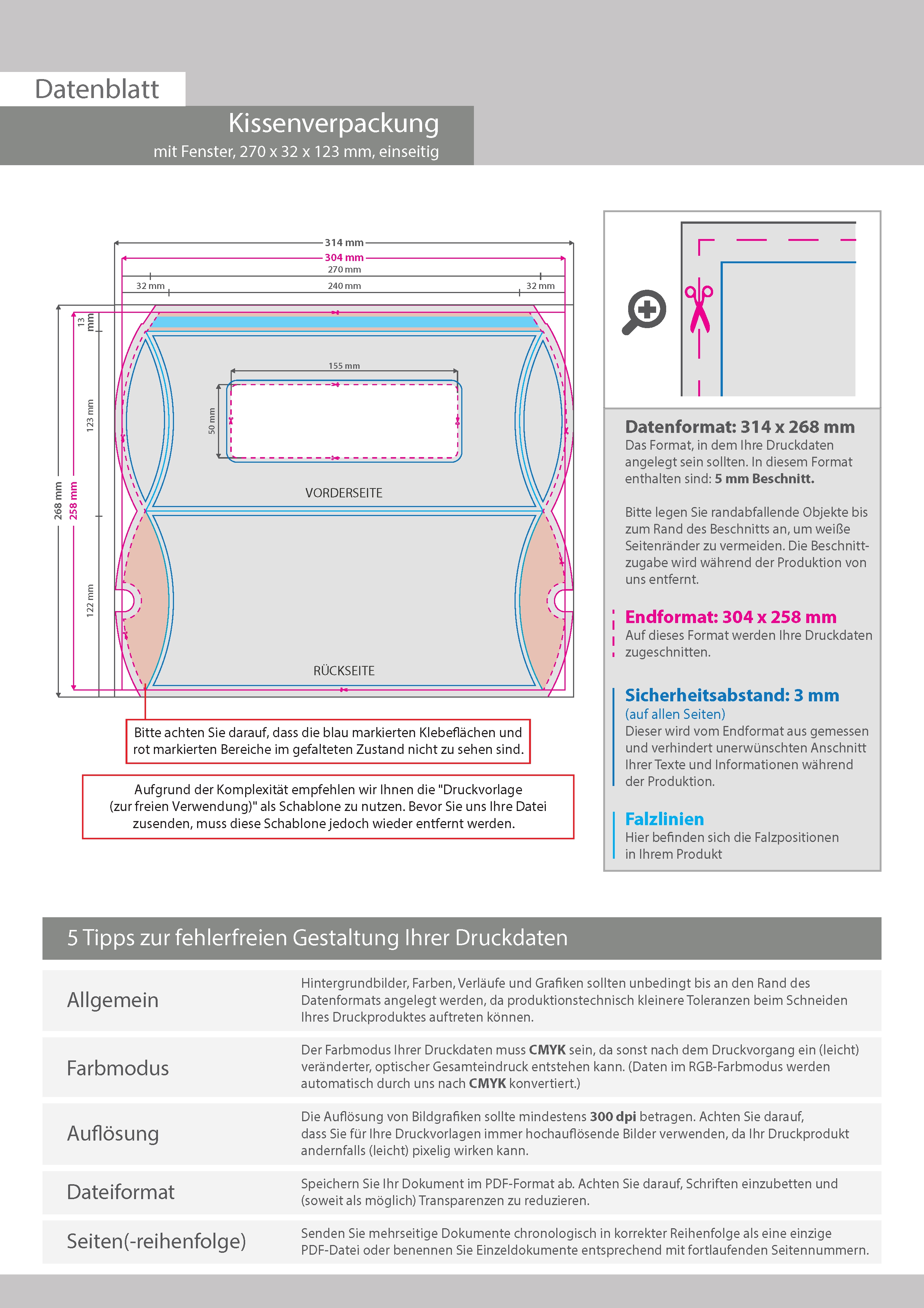 Kissenverpackung (27 cm x 3,2 cm x 12,3 cm) einseitig bedruckt 4/0-farbig mit gestanztem Fenster