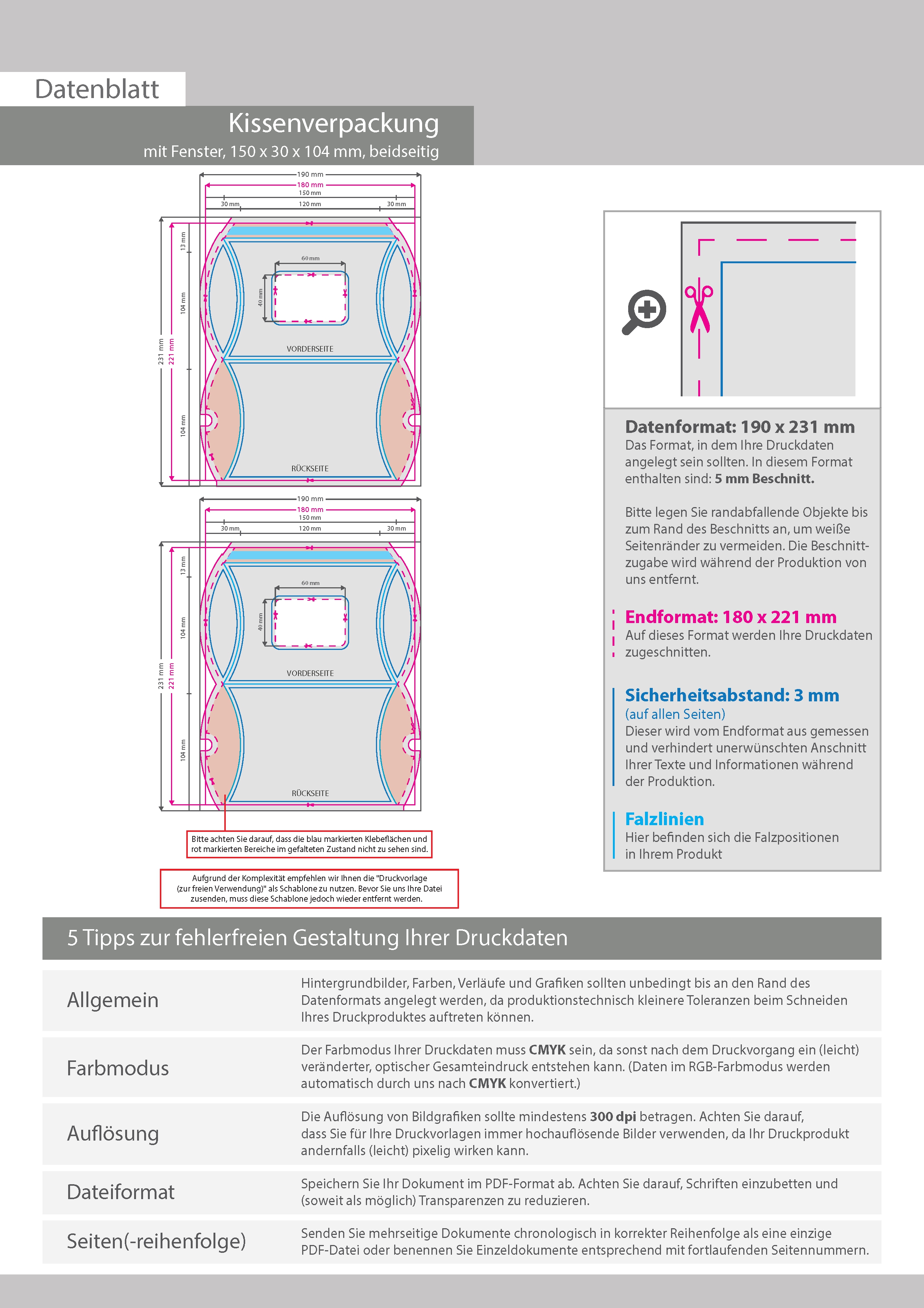 Kissenverpackung (15 cm x 3 cm x 10,4 cm) beidseitig bedruckt 4/4-farbig mit geklebtem Fenster