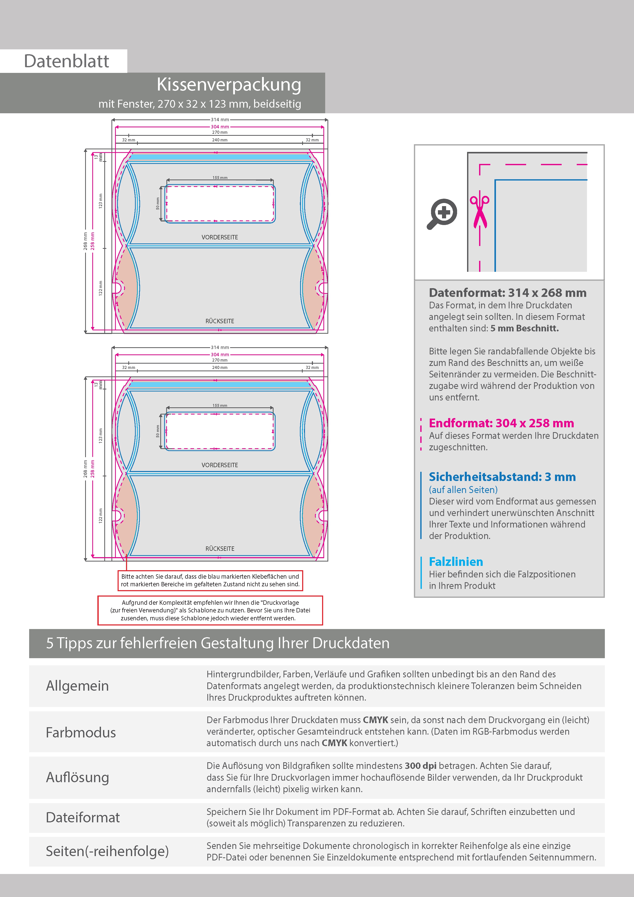 Kissenverpackung (27 cm x 3,2 cm x 12,3 cm) beidseitig bedruckt 4/4-farbig mit geklebtem Fenster