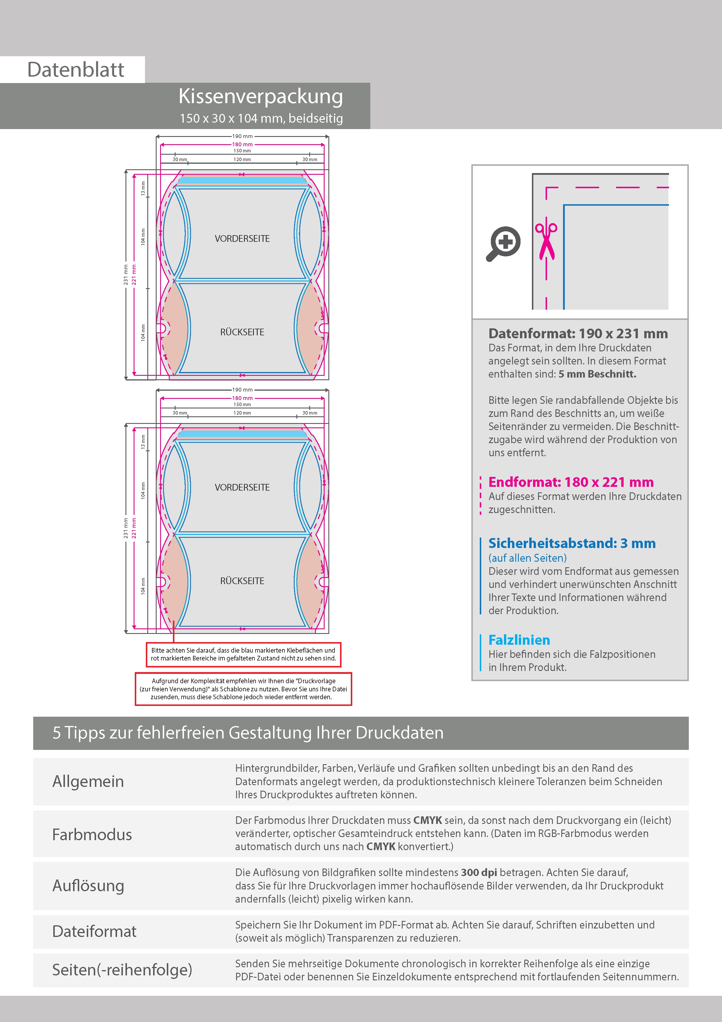 Kissenverpackung (15 cm x 3 cm x 10,4 cm) beidseitig bedruckt 5/4-farbig (CMYK + Sonderfarbe)