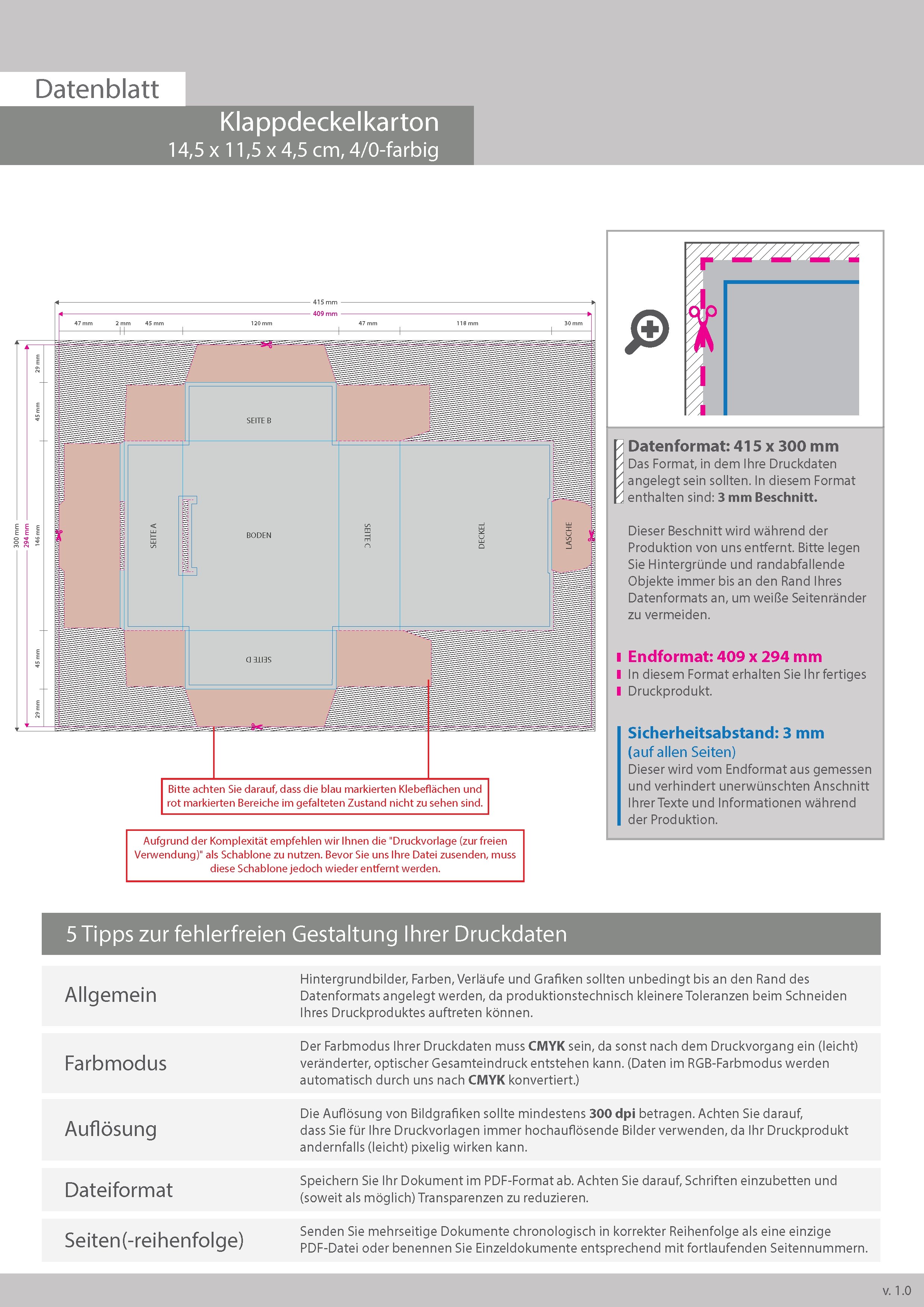 Klappdeckelkarton (14,5 x 11,5 x 4,5 cm), 4/0 farbig bedruckt (CMYK)