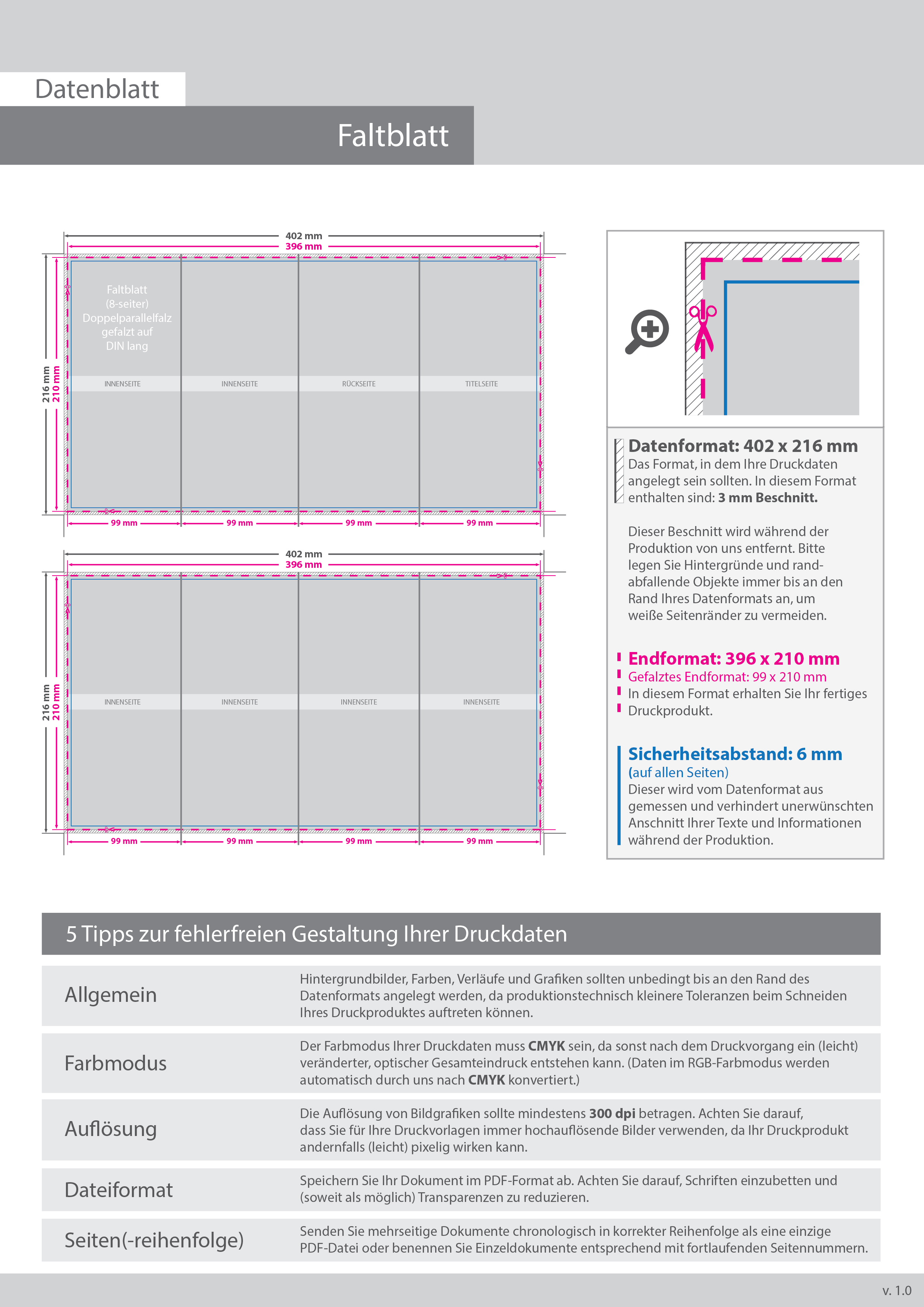 Faltblatt, gefalzt auf DIN lang, vertikaler Doppelparallelfalz, 8-seitig