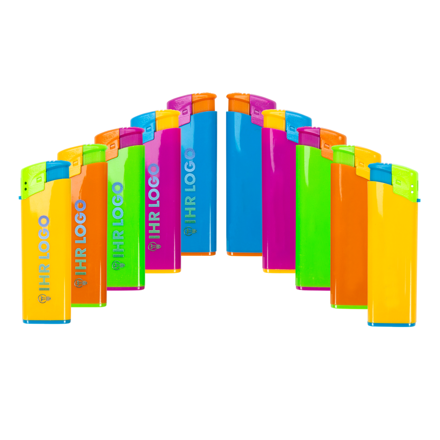 In unserem Shop finden Sie unterschiedliche Modelle in vielen wunderschönen Farben. Entscheiden Sie sich einfach für die Variante, die am besten zu Ihrem Unternehmen oder dem gewünschten Motiv passt! Unsere Elektro-Feuerzeuge bestehen aus robustem Kunststoff und sind alle nachfüllbar. Selbstverständlich erfüllen sie außerdem den Sicherheitsstandard für Feuerzeuge und sind überdies kindergesichert. Wir tragen Ihr 4-farbiges, individuelles Design abhängig von Ihren Wünschen mittels UV-Druck auf einer oder beiden Seiten auf. Die hierfür zur Verfügung stehende Fläche hängt vom jeweiligen Feuerzeugmodell ab.